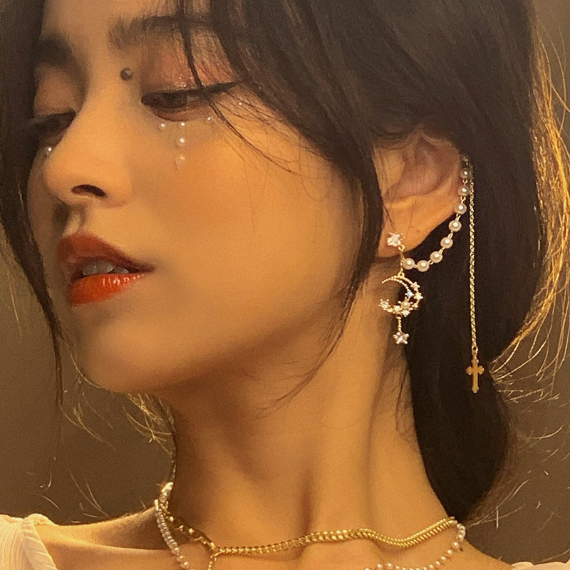 法式复古耳骨一体式珍珠长款耳钉气质网红小众设计感耳廓夹耳饰热门设计联盟服务商